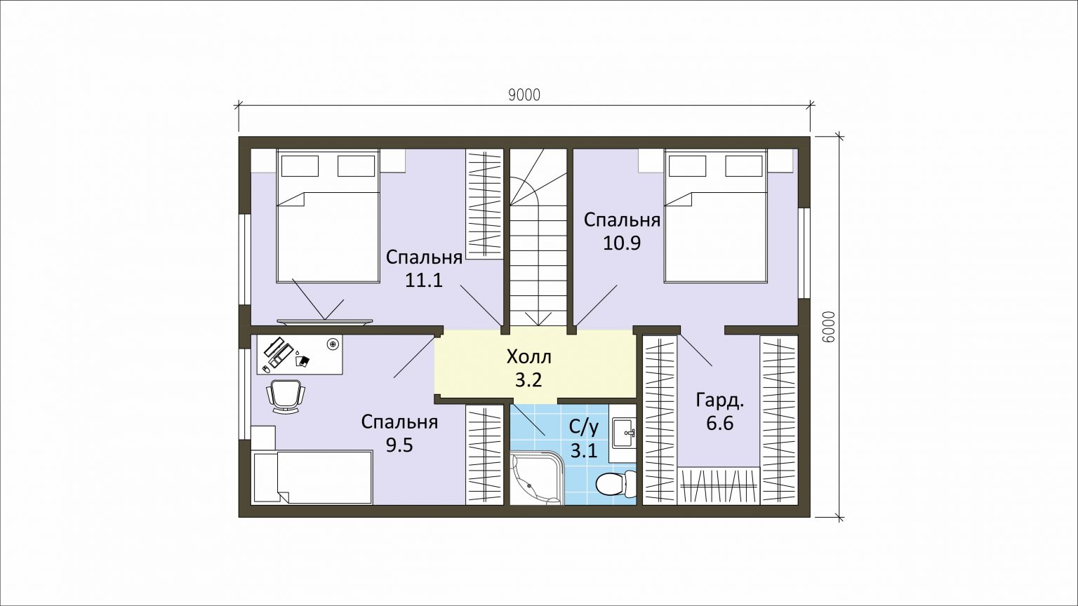 Каркасный дом “Фаворит” 9,5х9 в комплектации “Комфорт”