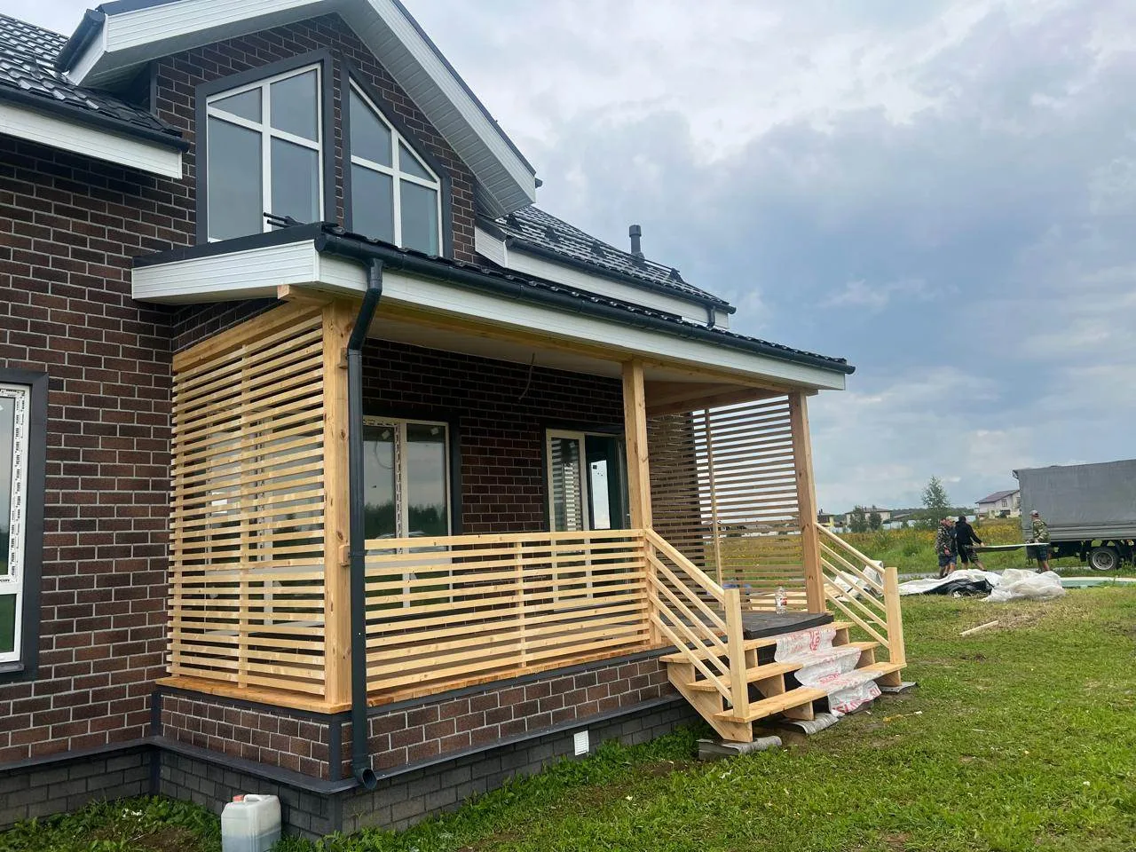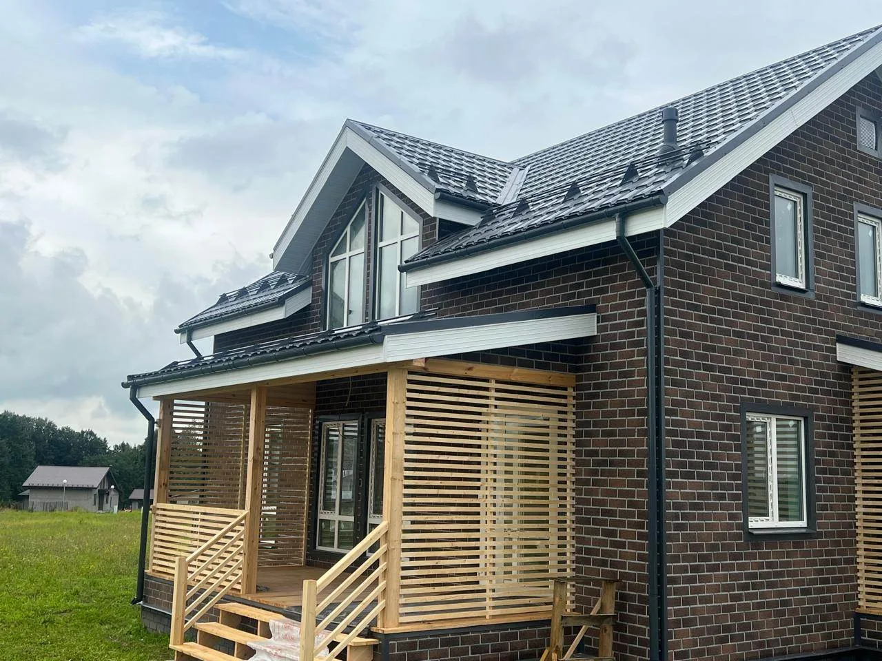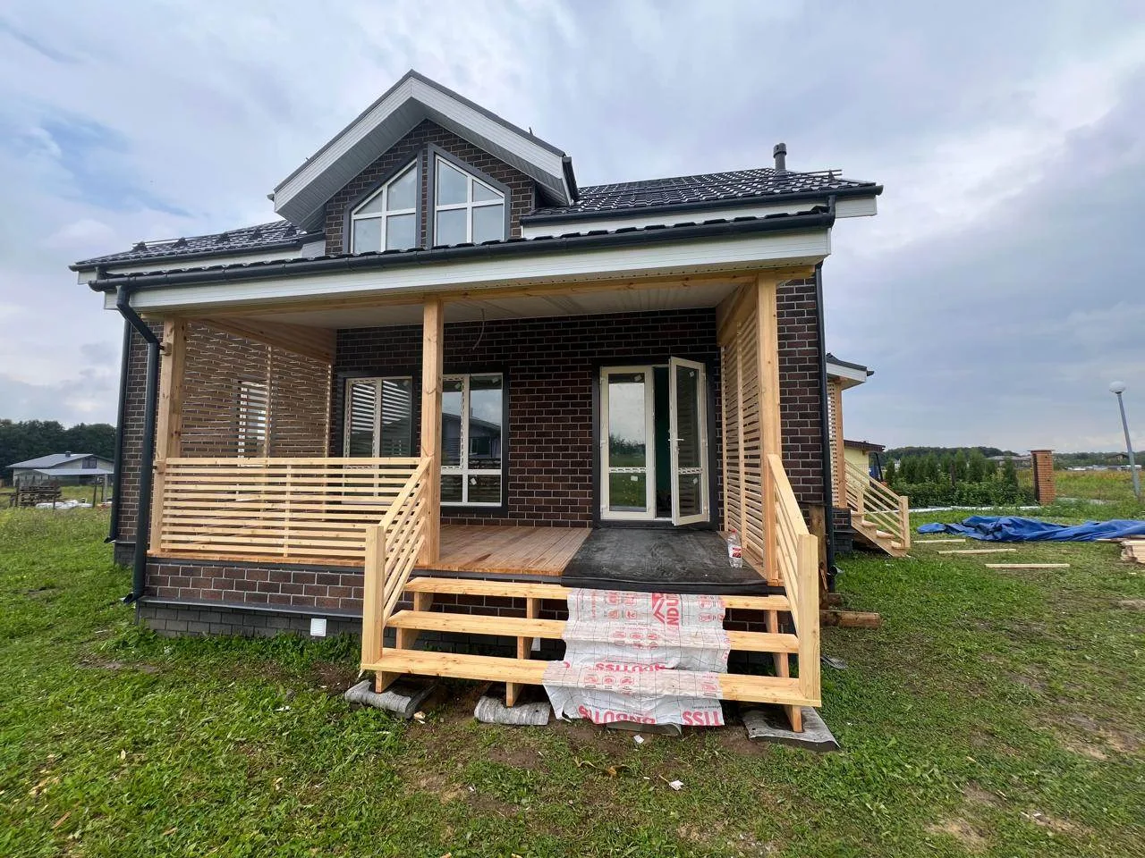 ДополнительноВ ПОДАРОК утепление монтируется с применением контура перекрестного утепления.Наружная отделкаФасадная плитка Хауберг по ОСП плите т.9мм.Внутренняя отделка стен и перегородокИмитация бруса 16х132 мм (+/- 1 мм), под внутреннюю отделку стен монтируется брусок 45х45 мм для скрытой разводки инженерных коммуникаций.
